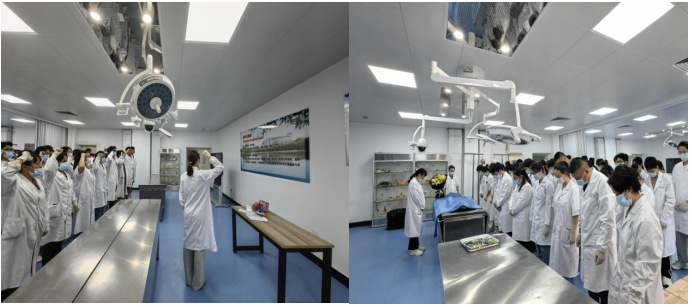 随后,全体师生怀着无比崇敬的心情,向实验室里的 “无言良师”默哀致敬,并依次敬献鲜花。一朵朵鲜花,承载着对逝者的缅怀与感恩。员工代表满含深情地说道:“他们虽无法用言语表达,但却是我们医学道路上最伟大的老师。每一次的解剖操作,都如同一场对生命奥秘的深度探索,更是一份对生命责任的庄重传承。”教研室的教师们也分享了遗体捐献者背后的感人故事,并宣读《解剖学伦理誓言》,全体员工在誓言的感召下,庄重承诺:“定当以科学严谨的态度投入学习,以人文关怀的精神践行医学使命,绝不辜负每一位‘无言良师’的生命之托。”