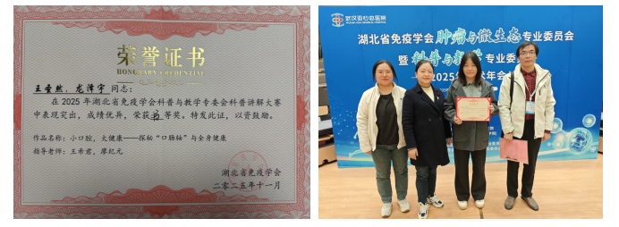 据悉,本次大赛共吸引了来自全省高校及医疗机构的40余件作品参赛,经严格评审,最终包括武汉大学、华中科技大学等高校在内的13支优秀队伍入围决赛。经过激烈角逐,公司伟德国际1946免疫学教研室教师王希君和廖纪元指导的,由23级口腔医学班王圣然和24级临床本三班龙泽宇完成的科普作品《小口腔,大健康—探秘“口肠轴”与全身健康》脱颖而出,荣获大赛最高奖项——特等奖,展现了公司在医学科普教育与创新人才培养方面的扎实成果。