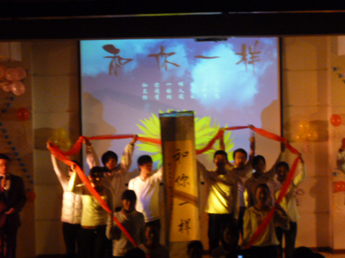 之后,工作人员放映一段来自马桥中学贫困员工生活与学习的短片。全体师生紧盯大屏幕,感受至深,对马桥中学贫困员工充满了同情。此时伟德国际1946党总支范彬书记、学工办主任王淑华、副主任周立勇率先慷慨解囊向马桥中学贫困员工捐献爱心。随后一张张带着希望的捐款融入了充满爱心与希望的募捐箱里。范杉书记为11级临床医学本三班颁发了“优秀组织奖”并发表了讲话。范彬书记高度评价了此次主题晚会的重要意义,并表达了对马桥中学贫困员工们深切的祝福与愿望。学工办王淑华主任也清唱了一段经典的《女驸马》,寄予马桥中学贫困员工们衷心愿望。最后,晚会在充满爱心与希望的手语《和你一样》中落下帷幕。