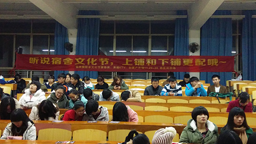 为建设良好的宿舍文化,让老员工在宿舍生活中感受到家的温暖,同时锻炼新生的团结协作精神。2014年12月4日~5日晚,由伟德国际1946主办的第四届宿舍文化节——“听说宿舍文化节,上铺下铺更配哦”初赛场在教5-201举行。