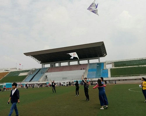 天空,才是风筝的归宿;翱翔,才是风筝的精彩。4月27日21支队伍的各个参赛选手带着自己的风筝按照安排早早在比赛场地上等候,足球场上挤满了观赛的同学。选手们迫不及待地放飞手中的风筝,飞快地奔跑着,只见天空中凌空飞起各种各样的风筝,像彩蝶在空中翩翩起舞,争奇斗艳。在天空中放飞的不仅仅是各支队伍涂鸦的五彩的风筝,也是队员们心中五彩的梦。