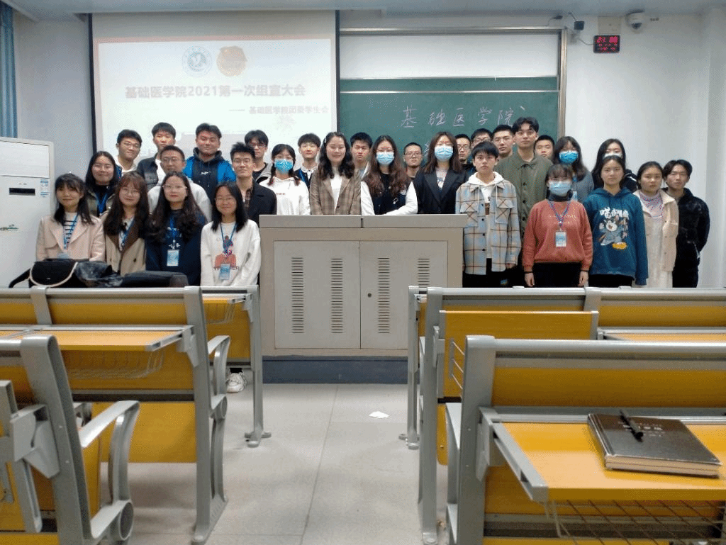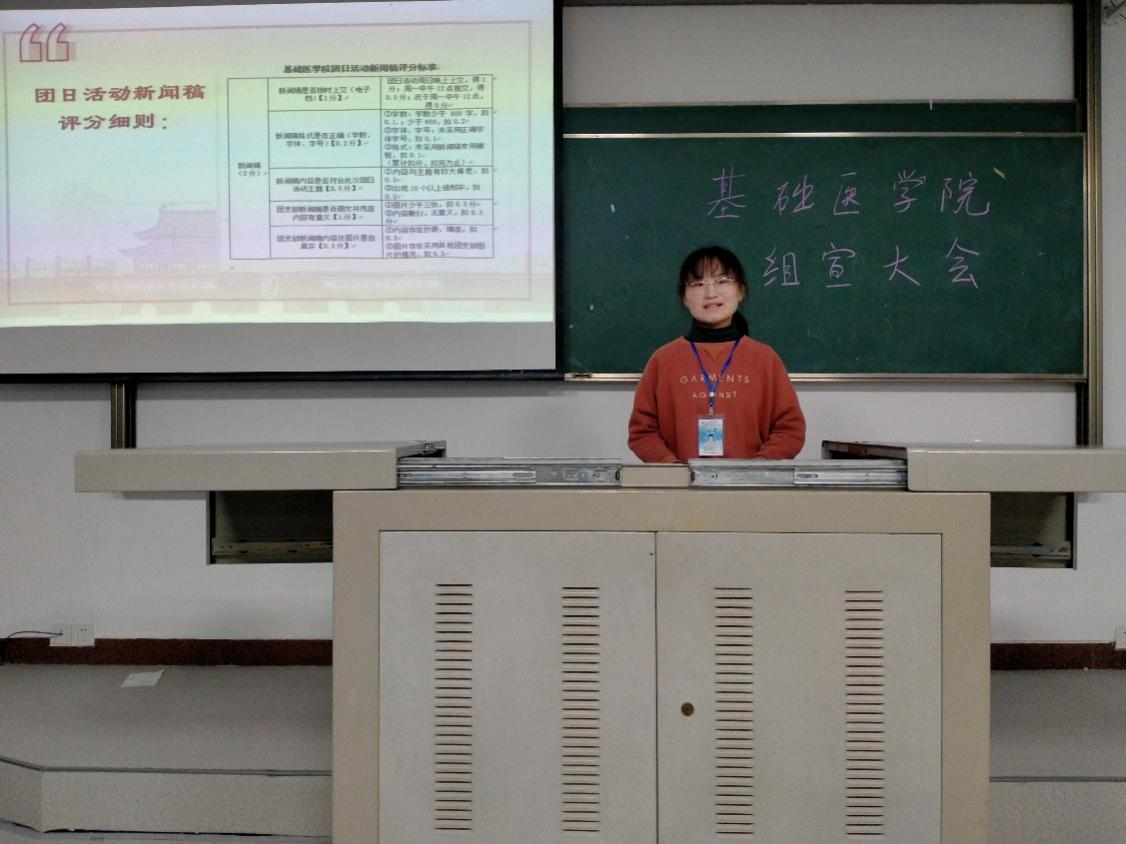 组织部部长李菁琦为本次大会的主持人,大会初,全体起立唱国歌,伴着同学们激昂的歌声,大会拉开帷幕。组织部和宣传部干事依次介绍自己和团日活动对接班级,希望通过此次大会,能与各个班级的团支部加强联系,齐心协力,共同合作,使基础院的团日活动内容更加丰富多彩。