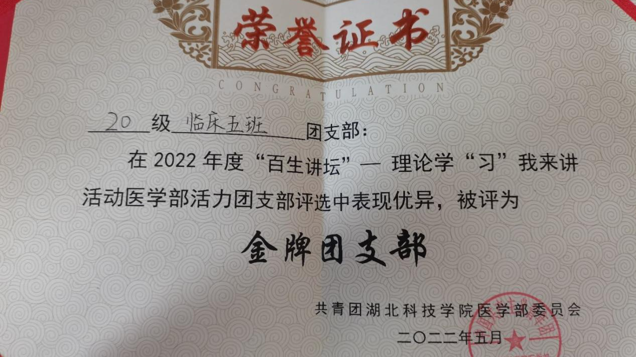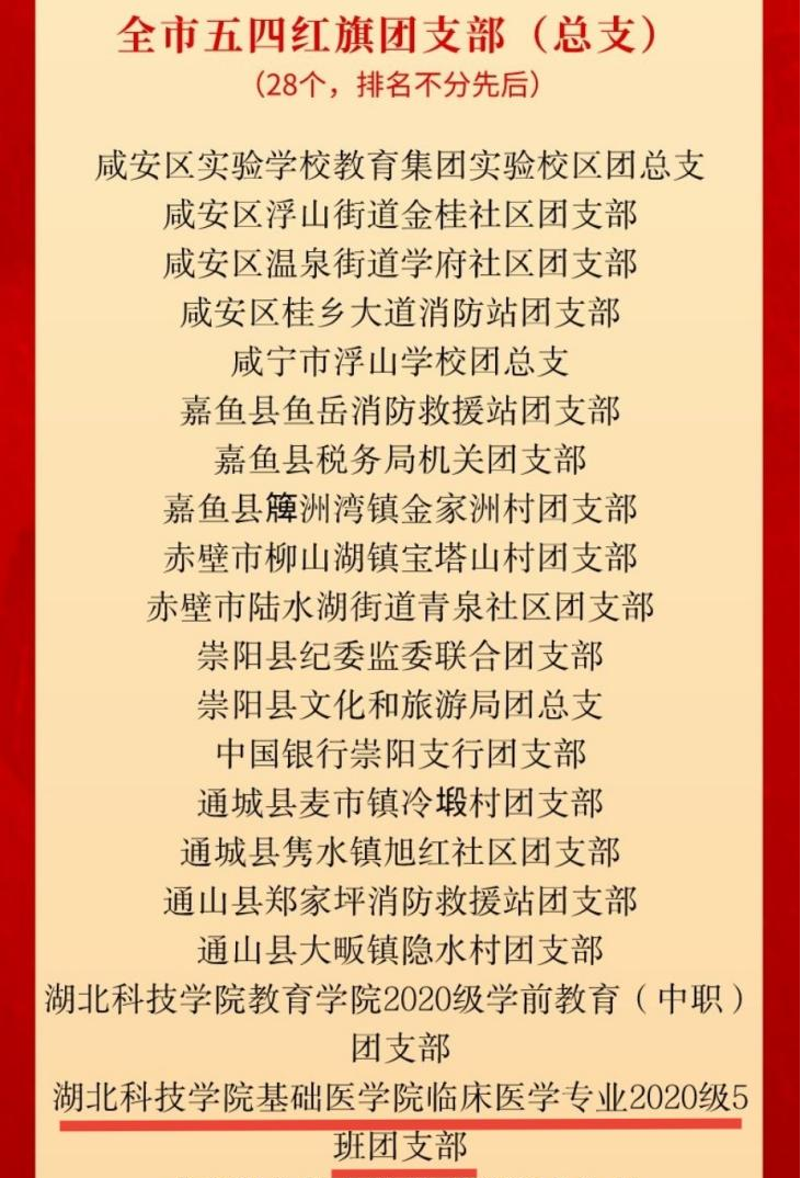 青年强则国强,“五四”青年节到来之际,一批咸宁优秀青年个人或集体获得表彰,其中,伟德国际1946临床医学专业2020级5班团支部获评咸宁市“五四红旗团支部”,团支部成立于2020年9月,设有书记1名,副书记1名,组织委员1名,宣传委员1名,文体委员1名,现有团员50人。曾获2021年度和2022年度伟德国际1946集团“先进班集体”,2021年度伟德国际1946集团“五四红旗团支部”等荣誉称号。