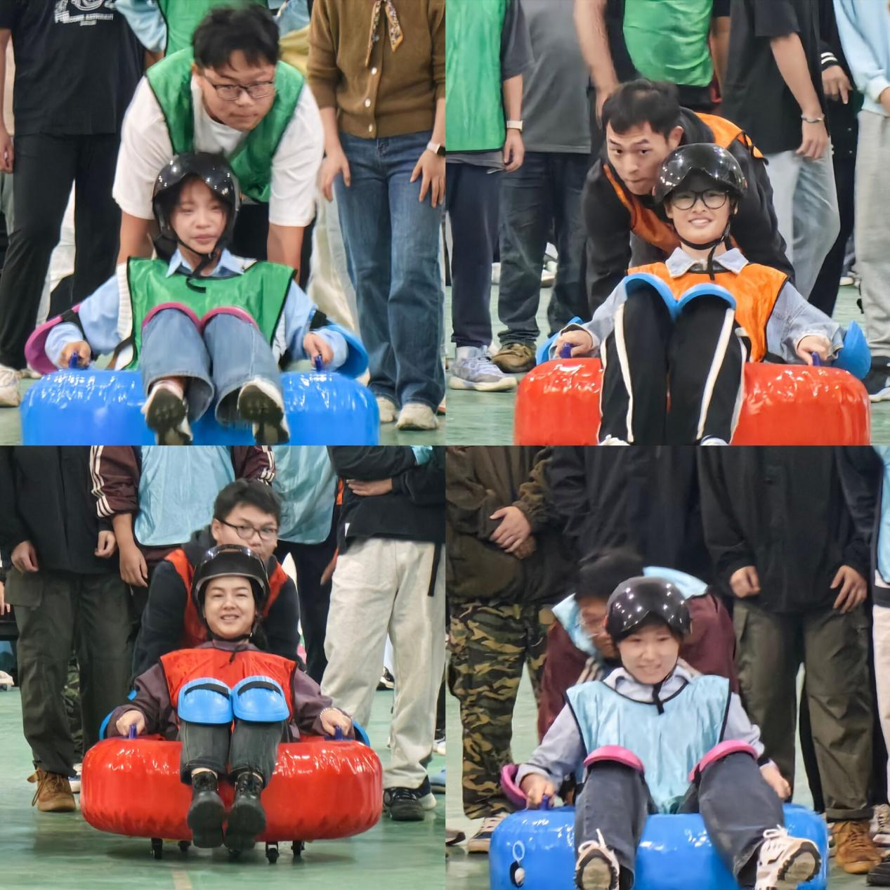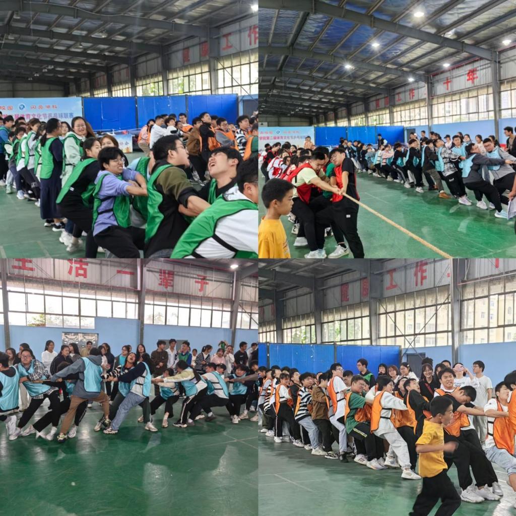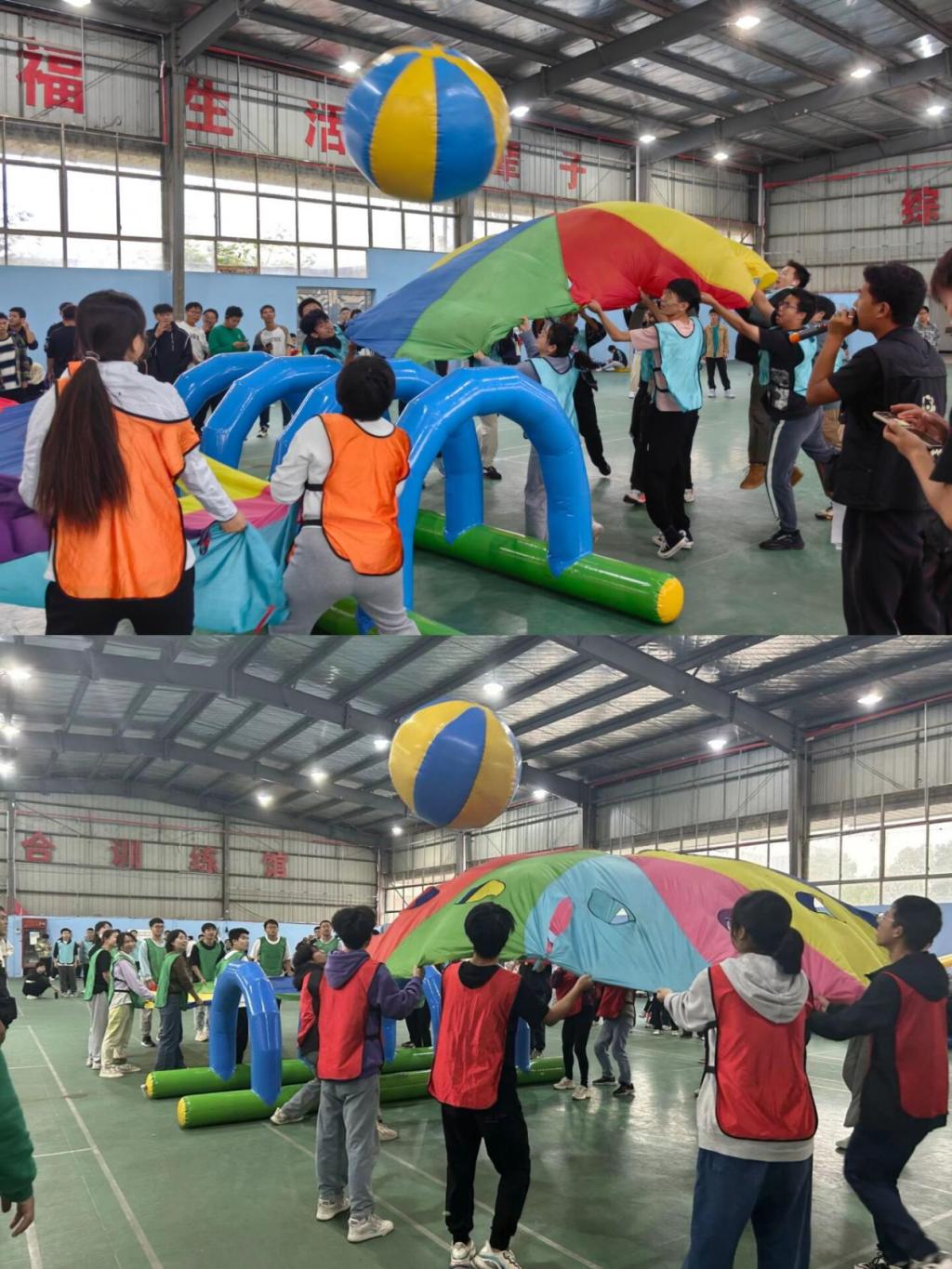 “真人冰壶”、“百米蛇形跑”、“超级障碍赛”等项目让参与的师生耳目一新。“巨型排球”项目大家兴趣盎然,球投过线时的精彩表现,令人欢呼不已;传统的“拔河”项目由老师和班级组队参赛,吸引了众多师生加油助威,各队使出浑身解数,选手们紧紧握住绳索毫不松懈,诠释了团结就是力量;“同心鼓”上弹跳的小球,鼓面清脆的“咚咚”声,是团结齐心的象征;“蒙眼喂橘子”的默契考验……师生同台竞技,尽显运动魅力,参赛队伍团结一致,奋勇争先,师生欢声笑语不断,活力满满。