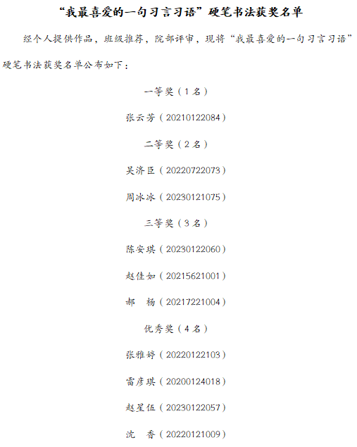经班级推荐、院级评审,最终选出了10份员工优秀书法作品,其中,张云芳同学获得本次活动的一等奖,吴济臣和周冰冰同学获得二等奖,陈安琪、赵佳如和郝杨同学获得三等奖,张雅婷等四名同学获得优秀奖。