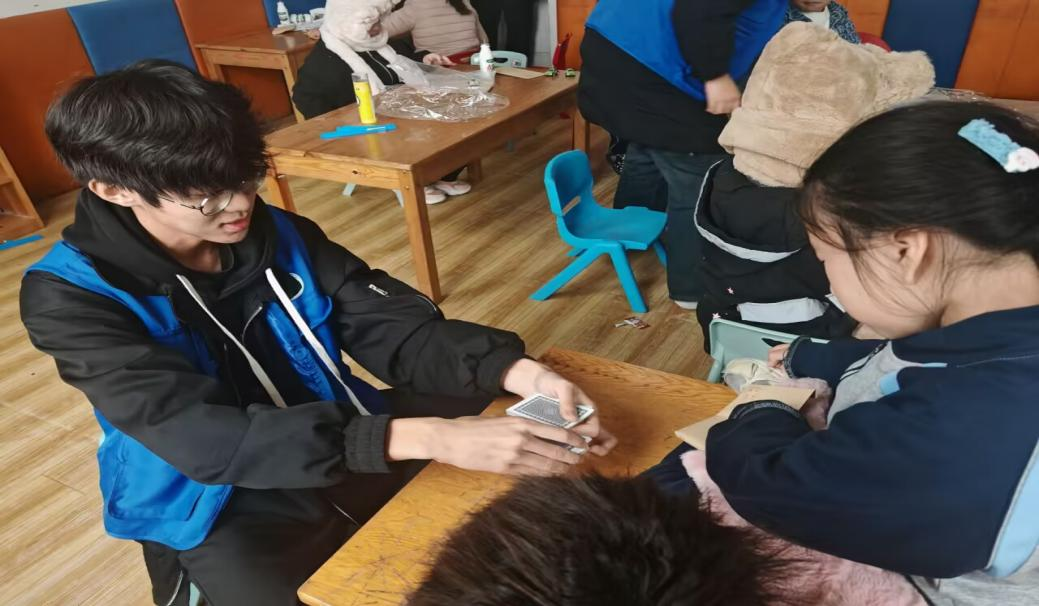 才艺表演环节,志愿者们合唱《超级棒棒糖》,教小朋友们跳手势舞《小小的花园》,还表演了舞蹈《我还有点小糊涂》。欢快的儿歌让小朋友们沉浸其中,也让志愿者们回忆起自己的童年时光。志愿者表演的魔术更是吸引了小朋友们好奇的目光,他们专注地看着志愿者手指翻动扑克牌,被深深吸引。在音乐与魔术的感染下,小朋友们也纷纷展示甜美歌喉。书信环节,志愿者将本校同学的手写信分发给小朋友们,并一起阅读。信件中的文字充满着湖科学子对小朋友们的关爱。最后,小朋友们收到了饱含志愿者的爱意的帽子、玩具车、发卡等小礼物。