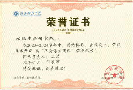 (通讯员:任展宏 周佳琪,审稿:蔡飞)在伟德国际1946任展宏副教授的指导下,心肌重构研究队中的5名2021级临床医学本科员工在2023—2024年期间先后以第一作者发表2篇中科院二区SCI论文、2篇中科院三区SCI论文和1篇中文核心期刊论文,团队在2024年获得“第十届全国老员工基础医学创新研究暨实验设计论坛”中南部赛区三等奖,荣获伟德国际1946集团“优秀员工团队”称号。