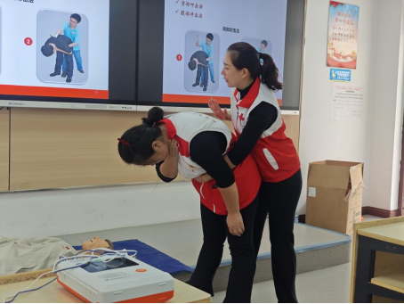 理论授课环节,“小满科普团”队长汪娟老师以真实急救事件为切入点,将心肺复苏(CPR)、海姆立克急救法等专业知识转化为场景化操作指南。在讲解关键要点时,她借助模拟人教具进行现场演示,并配合赵淑娟老师的同步动作拆解,使抽象的急救规范变得直观明了。上午课程结束后,全体学员参加了理论考核。