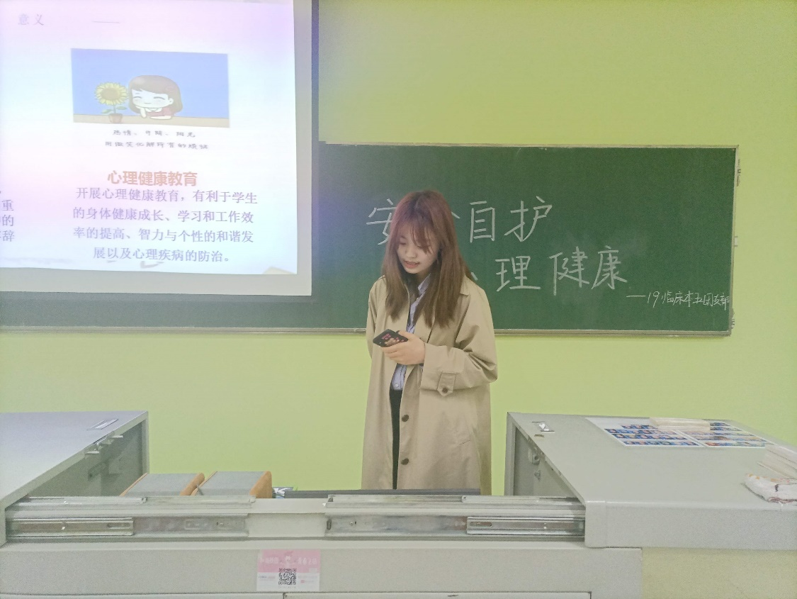 团日活动主持人首先向同学们分别介绍国家安全自护与心理健康教育的意义,通过分析身边经常会遇见的事例,同学们更切身体会到其重要性。