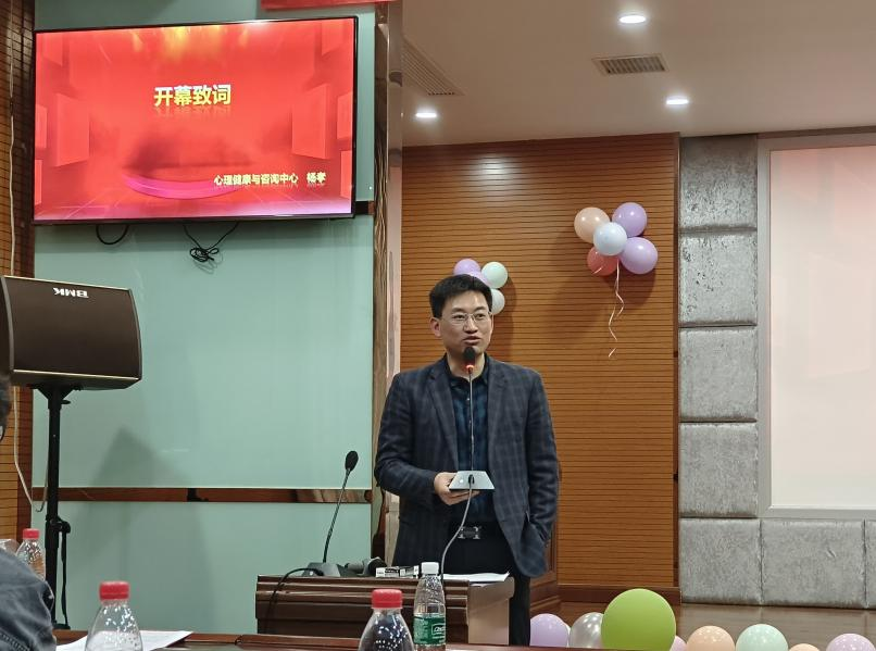 心理健康教育与咨询中心副主任杨孝为此次活动开幕致词,杨主任指出一定要做好新时代高校员工心理健康教育工作,实现心理教育工作高质量发展,推动全员参与,形成心理健康教育合力,促进心理教育工作专业化,共同筑牢高校心理健康教育工作体系,并对第12届心理健康月寄予了展望与期盼。