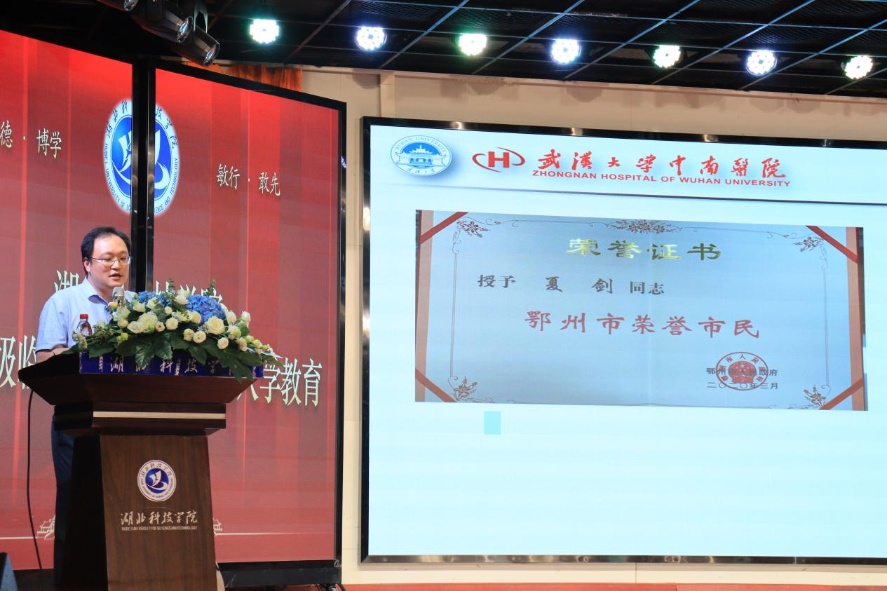 优秀员工武汉大学中南医院急救中心副主任夏剑作“仁心仁术”主题讲座。在讲座中他以自身的亲身经历和感受,向同学们介绍了医生需要面对的困难和挑战,以及要成为一名医生应该具备哪些能力和品质,同时也鼓励他们,在医学成长道路上需要不断努力奋斗,努力做一位保护人民健康、医术医德双馨的好医生。