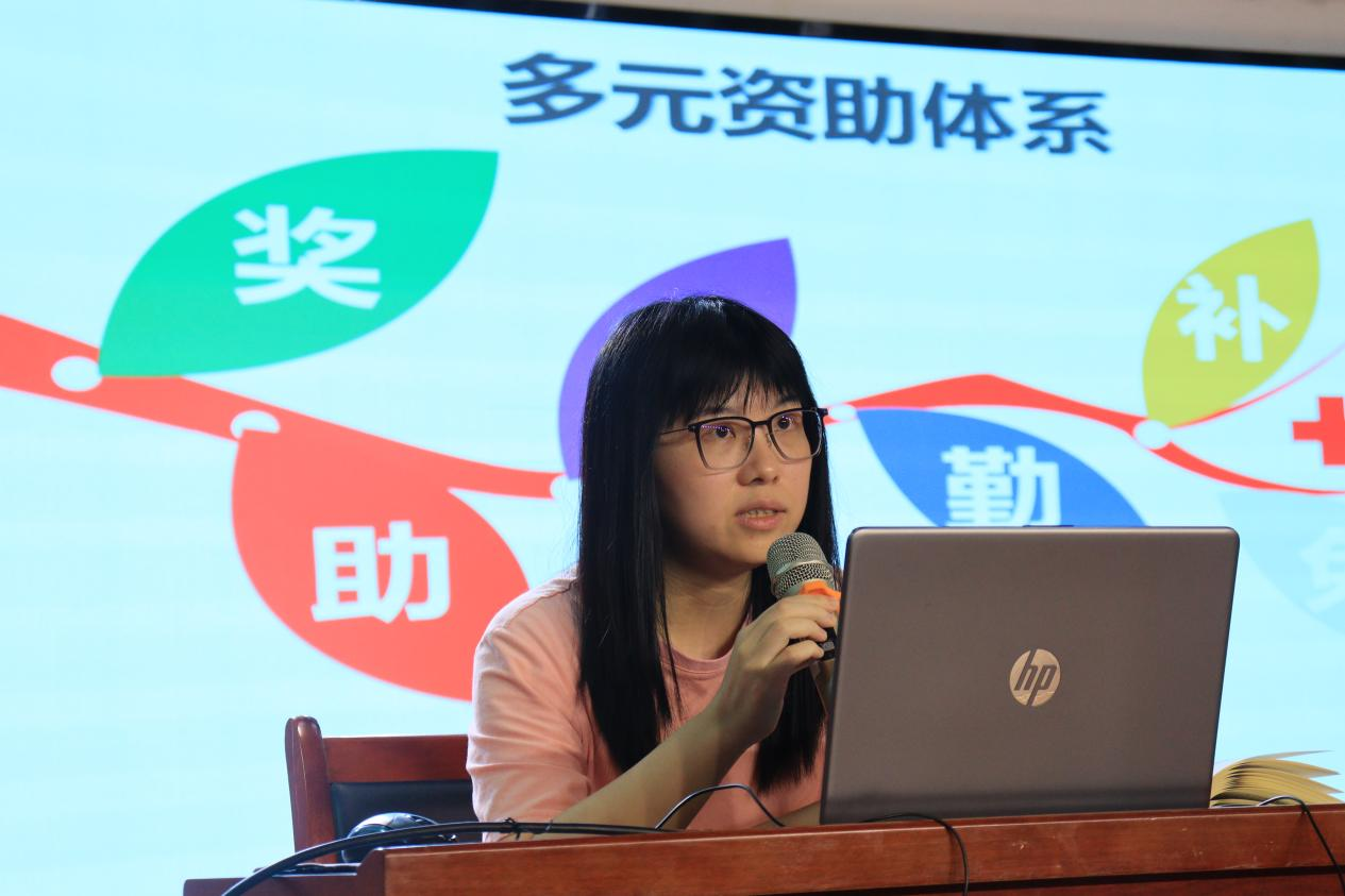 辅导员张泽影为新生详细介绍了各类资助政策,解释了评定细则及评定流程等。她强调,大家要以正确的心态对待奖助学金的评选,要以公平的方式参与评选,更要懂得感恩,以积极向上,自强自立的心态面对生活,回报社会与国家。
