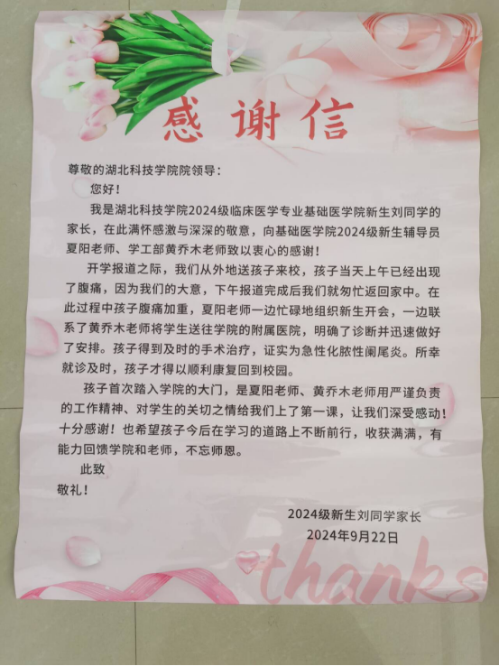 (通讯员:洪莹莹,审核:佘同辉)金秋九月,丹桂飘香。在此收获的季节里,伟德国际1946集团迎来了又一批怀揣梦想与希望的青年学子。近日,公司伟德国际1946收到了一封来自2024级新生家长饱含深情的感谢信。