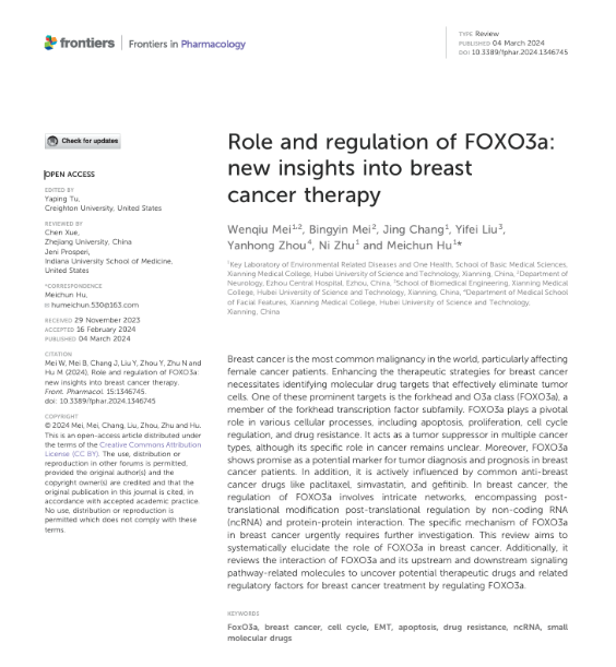 (通讯员:胡美纯梅文球,审稿:佘同辉)近日,伟德国际1946胡美纯教授指导并担任唯一通讯作者、临床医学本科员工梅文球作为单独第一作者,在国际期刊Frontiers in Pharmacology(中科院分区二区,IF=5.6)发表题为“Role and regulation of FOXO3a: new insights into breast cancer therapy”的综述性SCI论文,伟德国际1946是该论文第一通讯单位。该研究受国家自然科学基金、湖北省自然科学基金、伟德国际1946集团医学科研专项基金等项目资助。