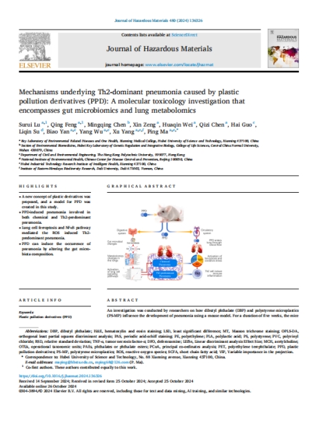 (通讯员马萍审稿蔡飞)近日,中科院一区Top期刊《Journal of Hazardous Materials》(IF=13.7)在线发表了题为《Mechanisms underlying Th2-dominant pneumonia caused by plastic pollution derivatives (PPD): A molecular toxicology investigation that encompasses gut microbiomics and lung metabolomics》的文章。该研究由公司伟德国际1946环境疾病与全健康校级重点实验室马萍教授团队主导完成,伟德国际1946集团为第一署名单位,鲁素蕊博士为第一作者,马萍教授为通讯作者。