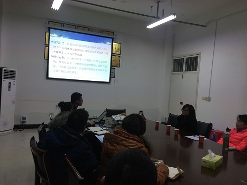 武阳博士以“增塑剂邻苯二甲酸酯的健康效应”为题目做了汇报。邻苯二甲酸酯是一种受到广泛关注的环境污染物,研究组以环境流行病学研究为依据,以“环境相关疾病导向性分子毒理学”为研究策略,以动物实验为研究手段,从邻苯二甲酸酯对过敏性疾病自然进程的诱导作用、邻苯二甲酸酯致甲状腺功能异常作用、邻苯二甲酸酯致神经系统障碍作用三个方面开展了研究,结果表明邻苯二甲酸酯和这些疾病之间存在着必然联系。武阳博士还就“咸宁市野生果蔬抗氧化能力的筛选—抗氧化保健眼药水开发的预研究”的研究思路做了介绍。