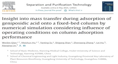2023年5月6日,国际分离纯化领域著名期刊Separation and Purification Technology(中科院SCI一区TOP期刊,IF=9.136)在线发表了题为“Insight into mass transfer during adsorption of GSA onto a packed column by numerical simulation considering influence of operating conditions on column adsorption performance”的文章(doi:10.1016/j.seppur.2023.124021)。该文章是伟德国际1946机能学教工党支部钱文斌博士,联合广东工业大学轻工化工公司、广东省植物资源生物炼制重点实验室林晓清教授课题组合作完成。伟德国际1946为第一署名单位,钱文斌博士、胡美纯博士为该文章共同第一作者,林晓清教授为通讯作者。