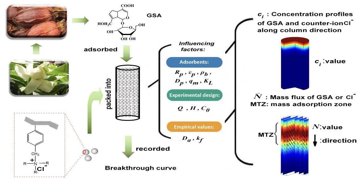 针对栀子黄提取废水中栀子苷酸资源高效回收、衍生物综合利用、降低废水COD等关键问题,该论文报道了一种利用阴离子交换吸附剂分离提纯栀子苷酸的新方法。论文对栀子果实中栀子苷酸,在吸附剂填充床中吸附工艺过程数学建模和优化这两方面进行了评述和推荐。利用动力学研究,揭示栀子果实中栀子苷酸在吸附剂内的扩散/传质机制;建立直观可预测吸附行为的色谱柱模型,指导并优化栀子黄提取废水中,副产物栀子苷酸在功能型改性阴离子交换吸附剂填充床内的分离回收效果。开发以吸附过程为核心的栀子苷酸的高效吸附回收集成技术,为吸附法在工业废水处理及天然产物资源利用领域的综合利用提供一定理论和技术支持。