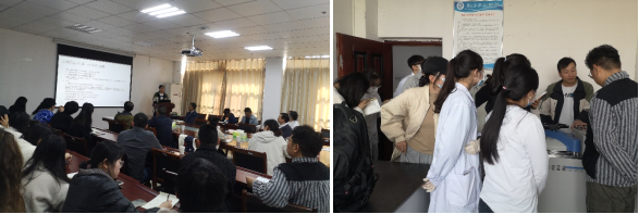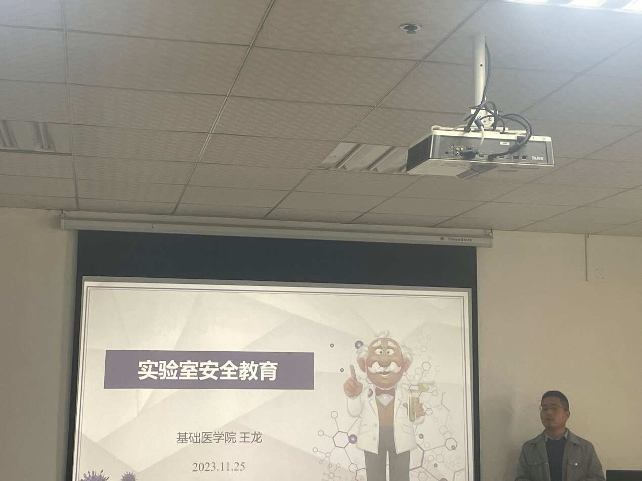 病原与微生物学教研室王龙博士做《实验室安全教育》为主题的专题讲座,重点关注实验室危化品管理、高温高压设备使用、消防安全和用电规范等,并对实验室可能存在安全隐患的实验废弃物、门窗水电、实验试剂、气体气瓶等危险源进行了全方位警示。