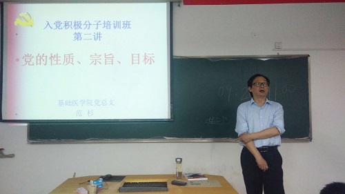 5月4日晚上,伟德国际1946分党校入党积极分子在解剖楼教室参加“中国共产党的性质、宗旨和目标”培训课,此次培训邀请到五官医公司党总支书记范杉担任主讲。