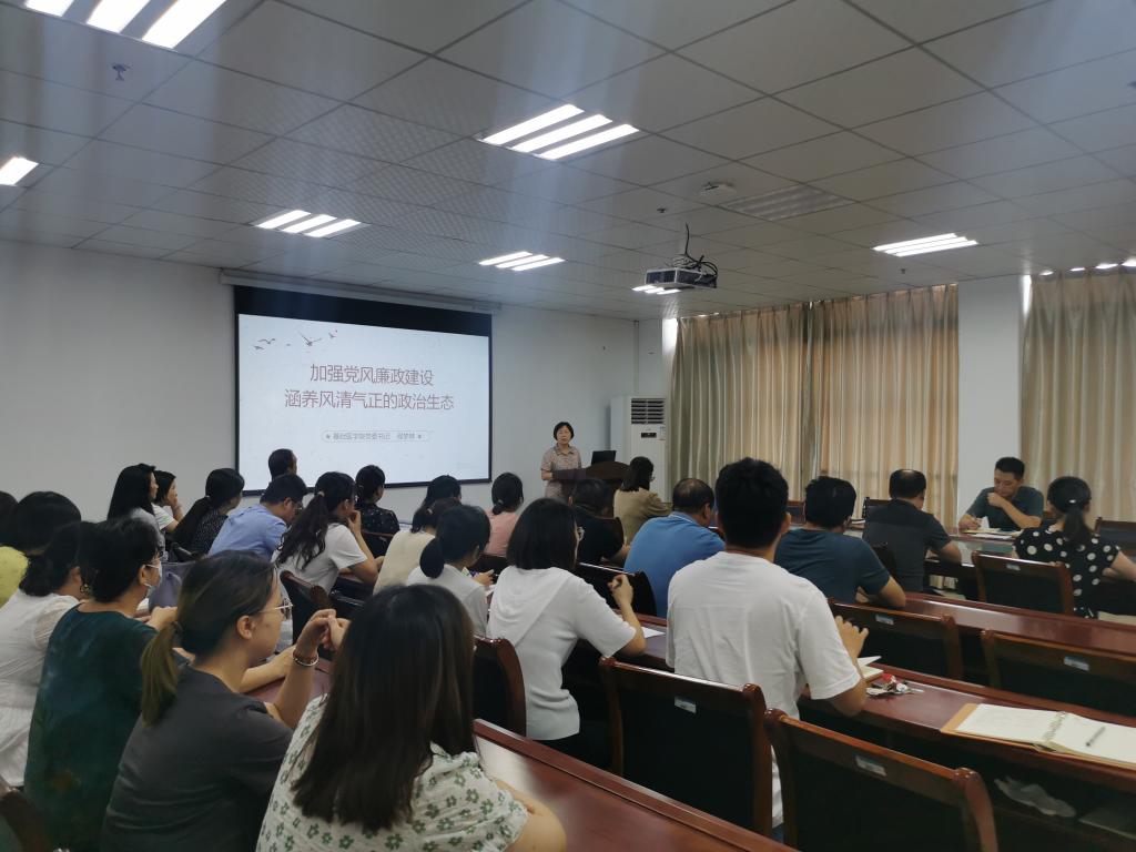 程梦琳书记从领悟加强党风廉政建设的重要意义、持续纵深推进党风廉政建设、汲取廉政传统文化养分、做实做细日常监督等四个方面内容展开讲述,结合近年来高校反腐败案例教育党员、干部、师生知行合一,绷紧纪律之弦,始终做到心有所畏、言有所忌、行有所止,严守纪律规矩,做忠诚干净担当的合格干部;指出党风廉政建设是一场攻坚战、持久战,必须坚定不移做好各项工作,要从坚定政治觉悟、坚持标本兼治、强化党内监督、树立文化自信方面下功夫;各级党组织要把主体责任层层落实,形成守土有责、守土负责、守土尽责的合力,树牢底线思维,做到为党育人、为国育才。