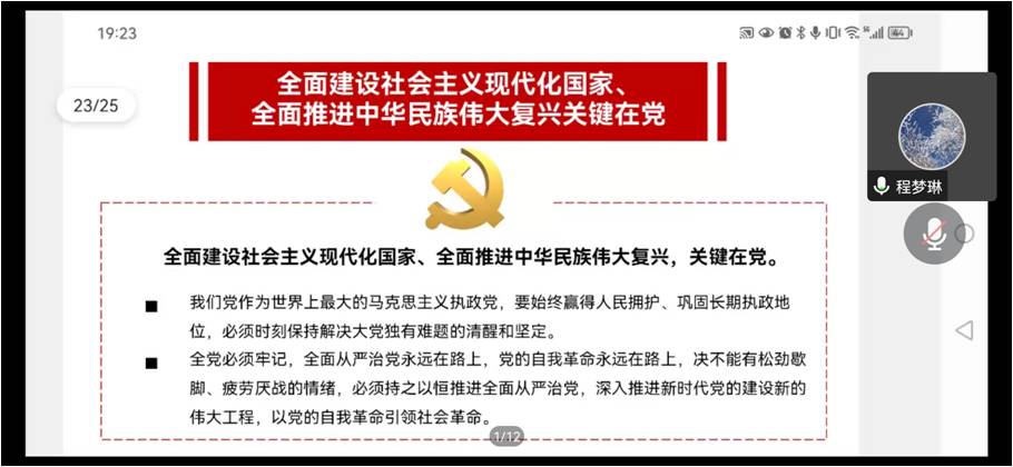 程梦琳根据权威资料解读,结合学习党的二十大精神的体会,介绍了党的二十大的基本情况,重点和大家共同学习了党的二十大提出的新观点、新论断、新思想。从“两个确立”、第二个答案、三个务必、三件大事、中国共产党的中心任务、中国式现代化等一系列的新观点中体悟党的二十大的丰富内涵。党的二十大报告将教育、科技、人才工作放到一起进行专章阐述,作出一体化部署,重视之高、篇幅之大、内涵之深前所未有,为公司奋力走好高质量发展之路提供了重要指引。