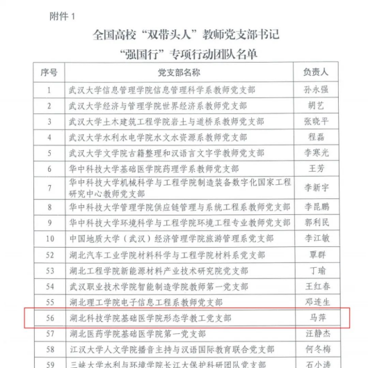 (通讯员:洪莹莹,审核:程梦琳)近日,教育部办公厅公布了全国高校“双带头人”教师党支部书记“强国行”专项行动团队名单,伟德国际1946形态学教工党支部成功入选,标志着该支部继获批“新时代全国党建工作样板支部”后,在党建工作领域再获国家级殊荣。