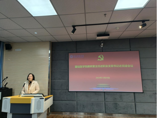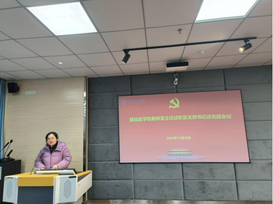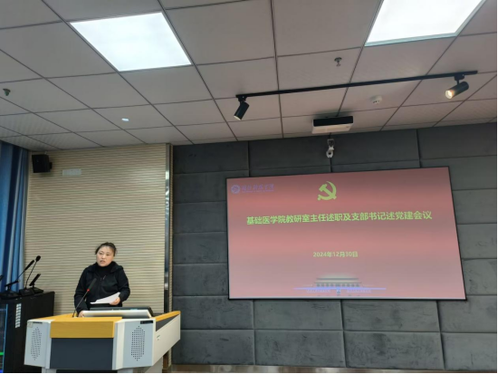 随后,形态学教工党支部书记马萍、机能学教工党支部书记朱海丽、病原学教工党支部书记朱薿、员工党支部书记夏阳依次进行了现场述职。各支部重点汇报了落实重点任务、党建业务融合等日常工作情况,全面总结党支部一年来在推动理论学习、思想教育、业务提升等方面所取得的工作成效。同时,深入分析了支部党建工作存在的问题和不足之处,并提出支部下一年度的工作思路和解决问题的对策。